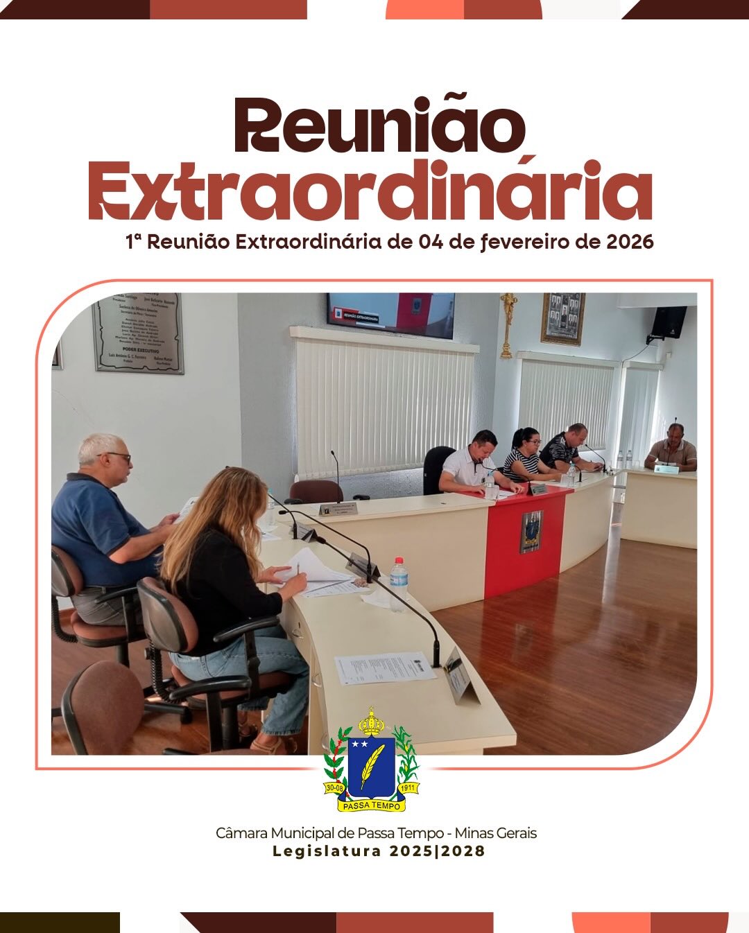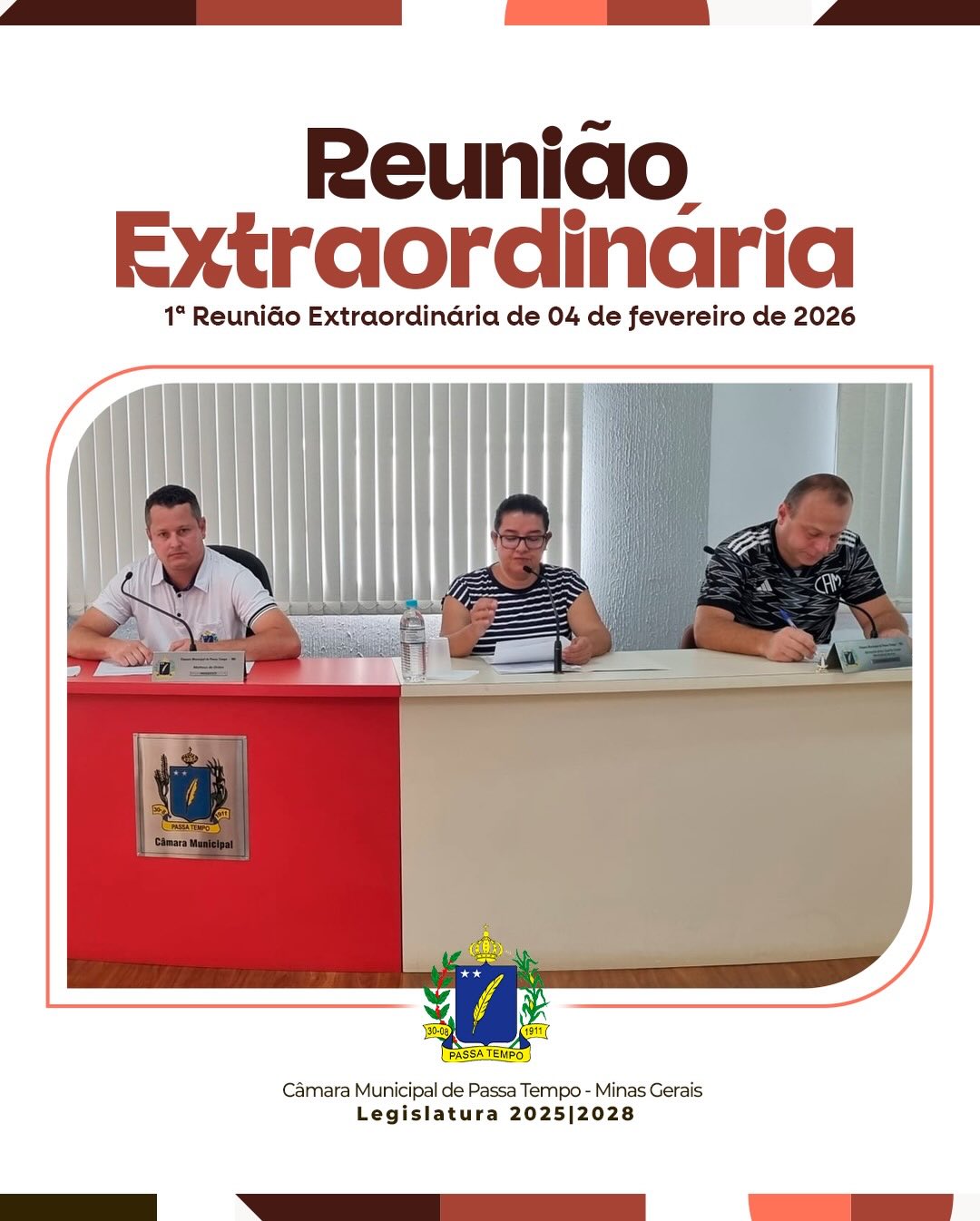 A Câmara Municipal de Passa Tempo realizou, no dia 04 de fevereiro de 2026, às 16h, a 1ª Reunião Extraordinária do ano, no Plenário Antônio de Souza Faleiro, com presença de 7 vereadores, havendo quórum regimental.