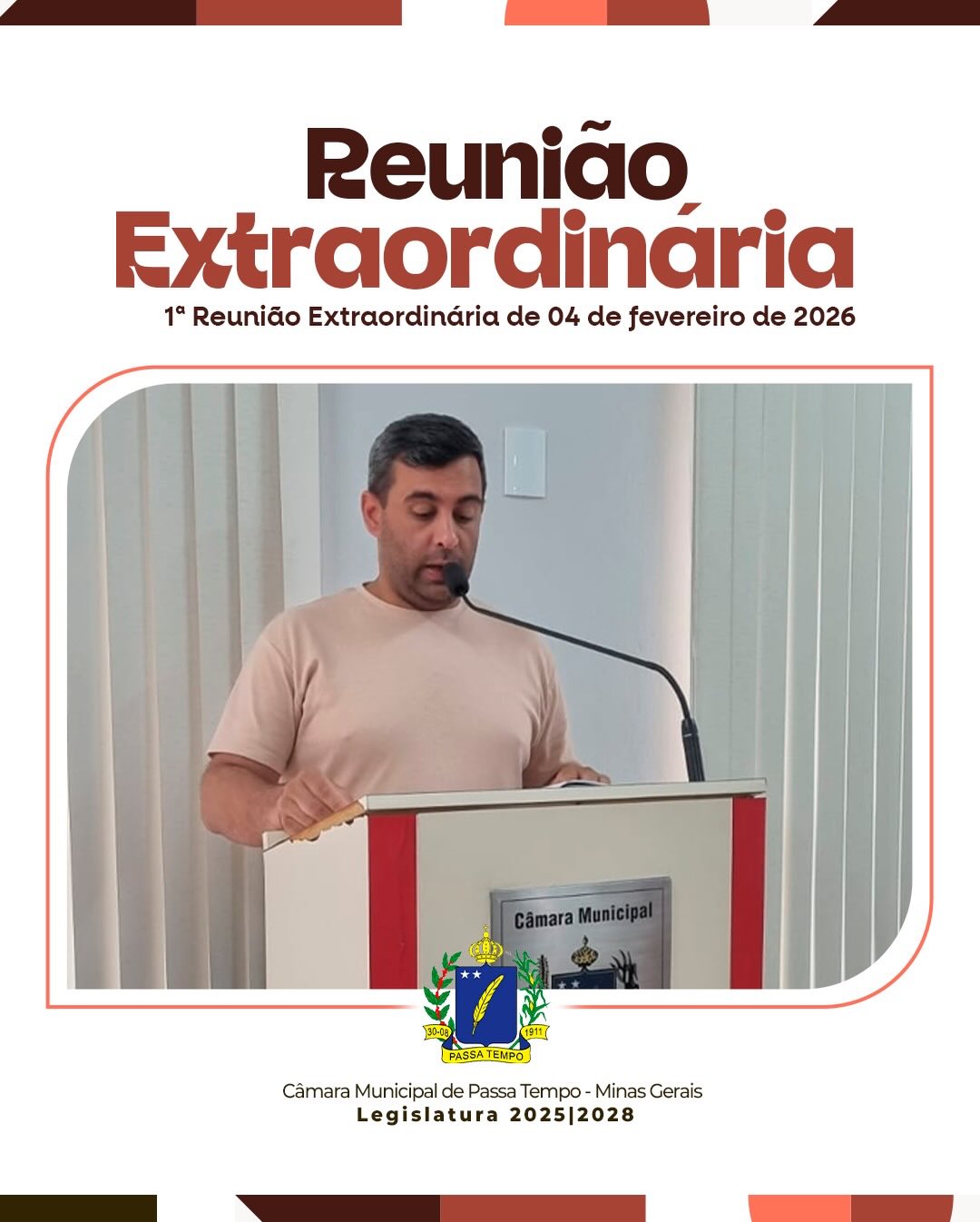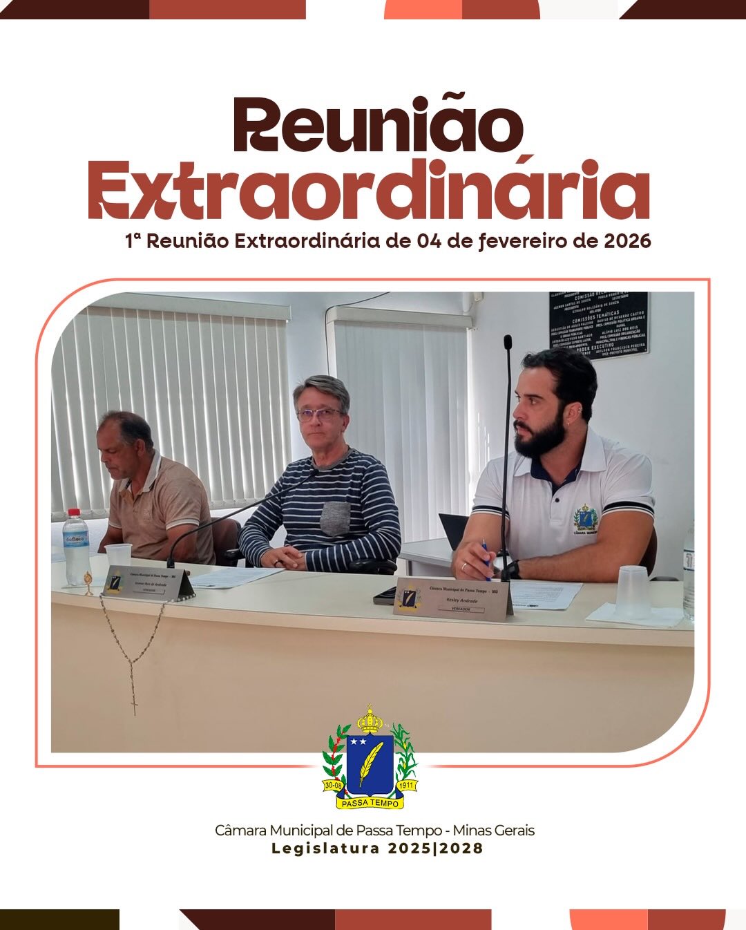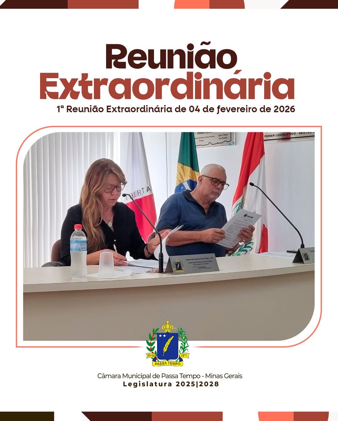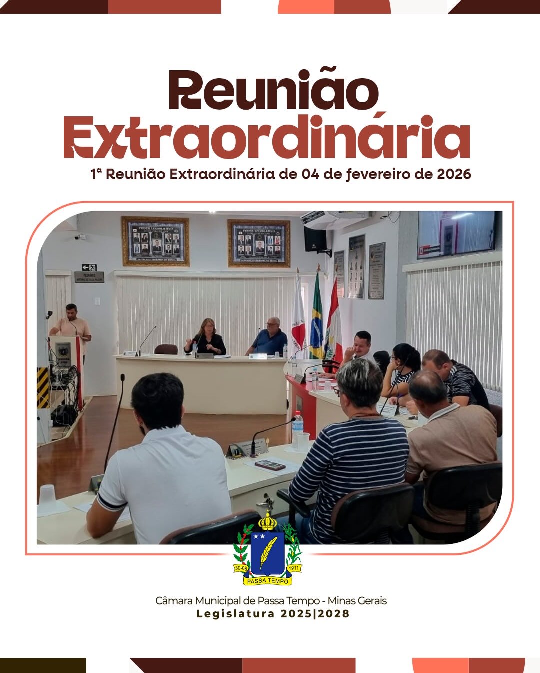A Câmara Municipal de Passa Tempo realizou, no dia 04 de fevereiro de 2026, às 16h, a 1ª Reunião Extraordinária do ano, no Plenário Antônio de Souza Faleiro, com presença de 7 vereadores, havendo quórum regimental.
